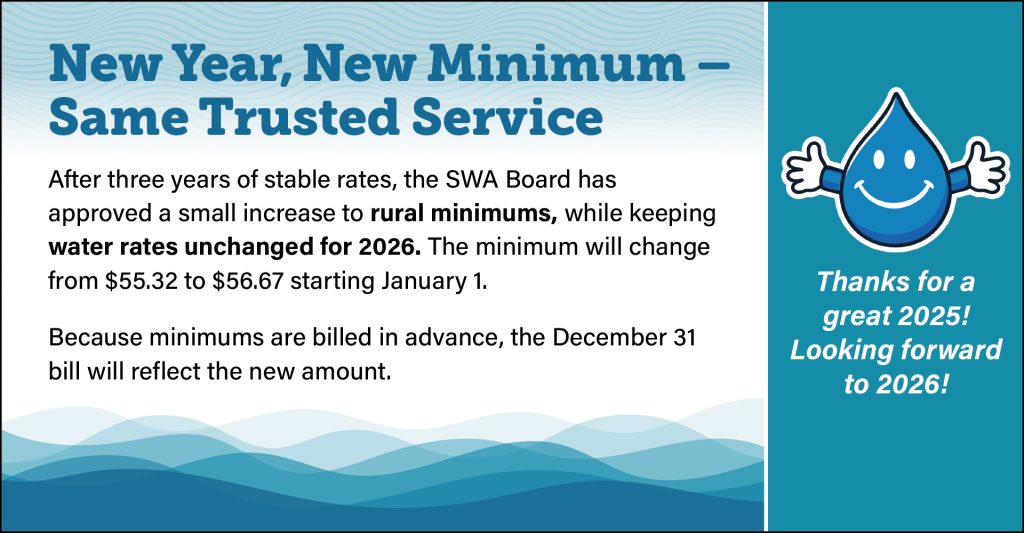 Jen Murray, SWA's Manager/CEO, expressed gratitude for SWA’s dedicated staff and board of directors who work tirelessly to ensure the smooth operation of the water services. "The careful planning and resource allocation of SWA's Board of Directors has proven that rate increases in 2024 are unnecessary, especially when many are experiencing financial stress due to economic fluctuations," Jen stated. Still, she encourages customers to continue using water wisely to keep their bills as low as possible.